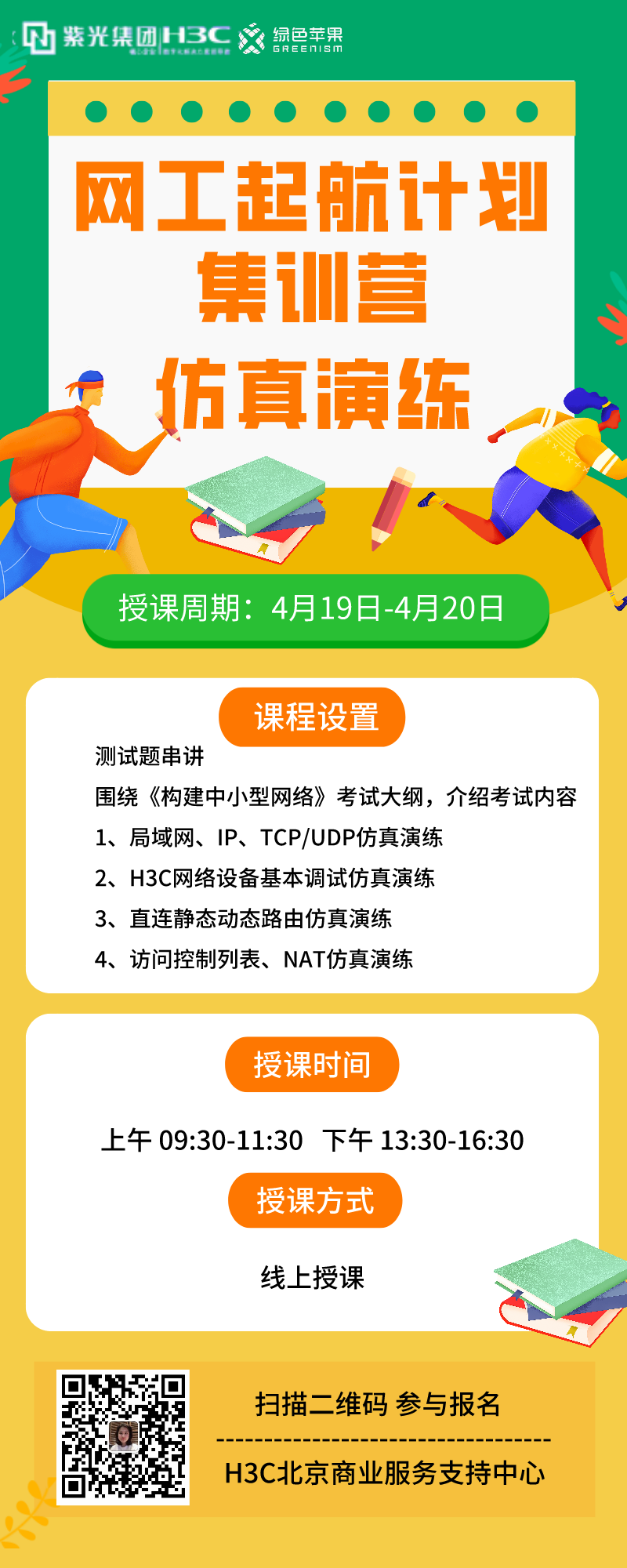 新课程开课啦!课堂内容丰富,讲师负责有耐心! 欢迎扫描上方二维码踊跃报名! 上期 课堂回顾 网工起航计划集训营高可靠性技术专题 2021年4月8日-4月9日,网工起航计划集训高可靠性技术专题由紫光股份旗下新华三集团北京商业服务中心承办,绿色苹果定位“数字化全流程服务”联接新华三数字化方案为合作伙伴提供销售、售前、售后的整体服务,与合作伙伴“共同服务好客户”是我们的宗旨,助力新华三及新华三合作伙伴共同提升业绩。 课程采用线上模式,保证让更多的同学,学习到本节课程的知识。 主要从1、了解什么是高可靠性技术 2、了解链路备份技术和设备备份技术 3、掌握链路聚合LACP、VRRP、RRPP、smart link、monitorlink技术原理 4、了解IRF基本思想,四个大方面进行讲解,让大家在课堂学习的过程中更加深入了解!课堂上讲师也详细回答了大家所提出的疑问。 线上同学们参加学习态度积极,讲师认真负责,针对课堂上每个同学不同的接受程度进行讲解,保证每个同学都有收获!线上平均每天在线人数在20人左右! 课程内容丰富,知识点详细,北京商业服务支持中心推出免费课程,鼓励全面完善个人技能提升自我,为大家提供便捷的学习途径!